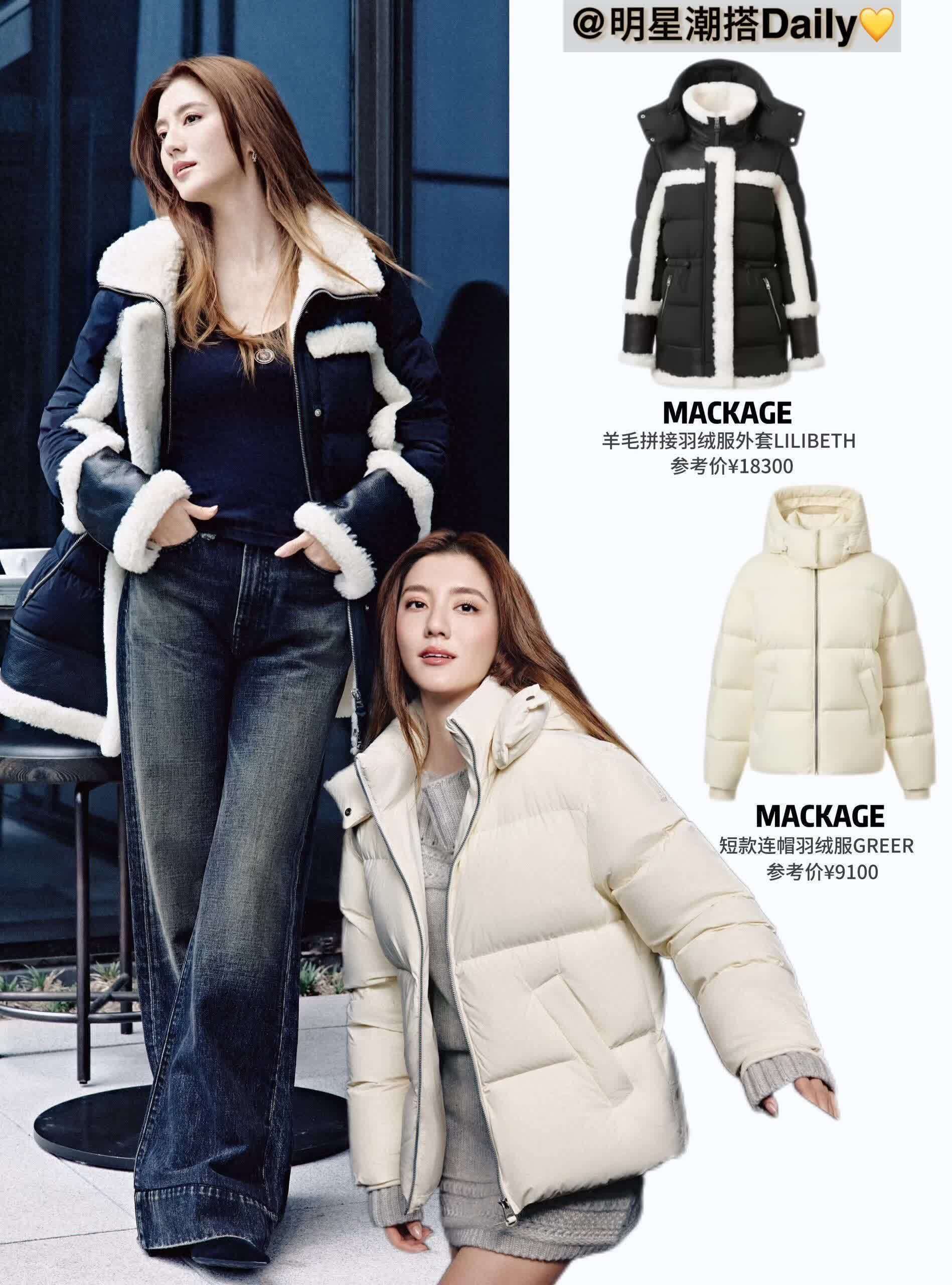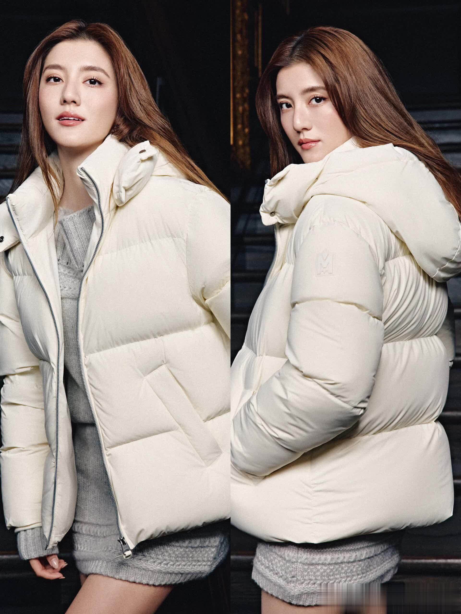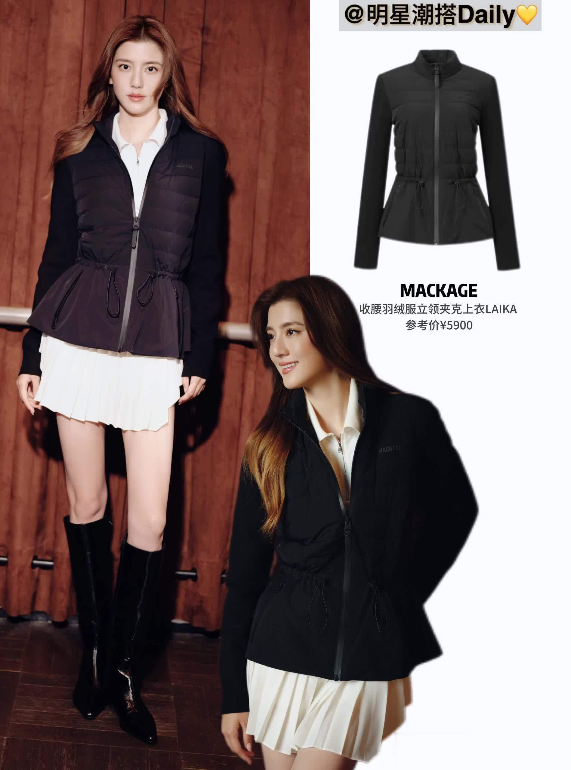 再看吴千语,模特出身果然不一样,每一套都像时装大片!羊毛拼接羽绒外套配深色牛仔裤那套,层次感玩得太溜了——硬挺的羊毛面料拼上软乎乎的羽绒,再搭条磨边牛仔裤,休闲里带点酷,日常出街这么穿,回头率绝对高。还有那件收腰立领夹克羽绒服,抽绳设计太懂女生了,随便一拉就显腰细,配条短裙和长靴,露出一截腿,又酷又俏,感觉下一秒就能去拍机车大片!